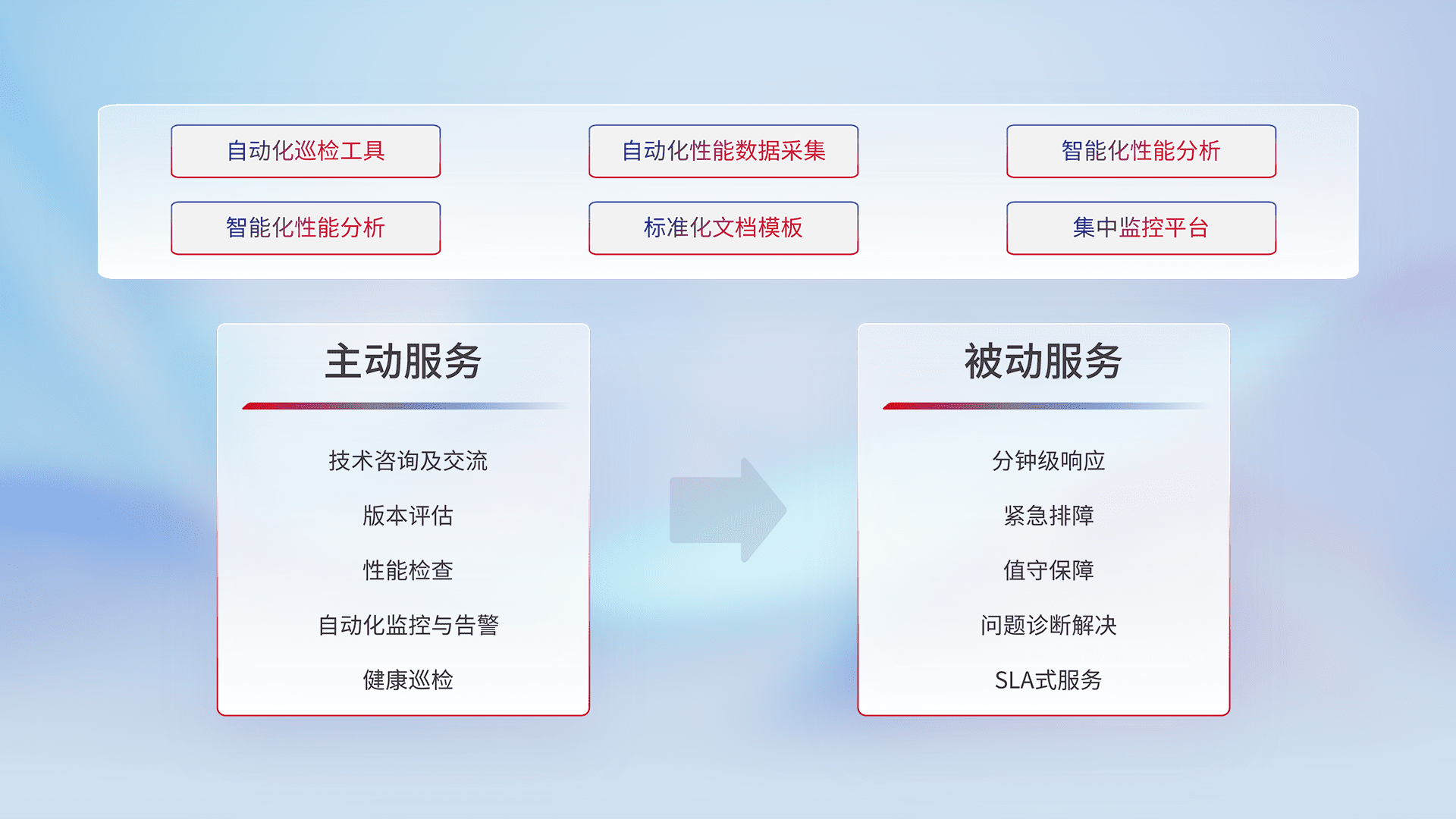 智能化工具和标准化文档,,,,保障服务质量,,,提供主动服务(包含技术咨询、、、版本评估、、性能检查、、、、自动化监控与告警、、健康巡检)和被动服务包含(分钟级响应、、、、紧急排障、、、、值守保障、、问题诊断解决、、、、SLA服务)。。。。