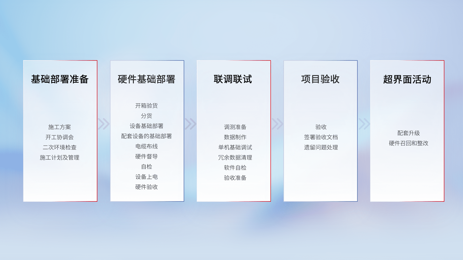 从基础部署准备、、、、硬件基础部署、、、、联调联试、、、项目验收、、、、越界面活动的全过程可追溯,,,保证施工质量和进度。。。